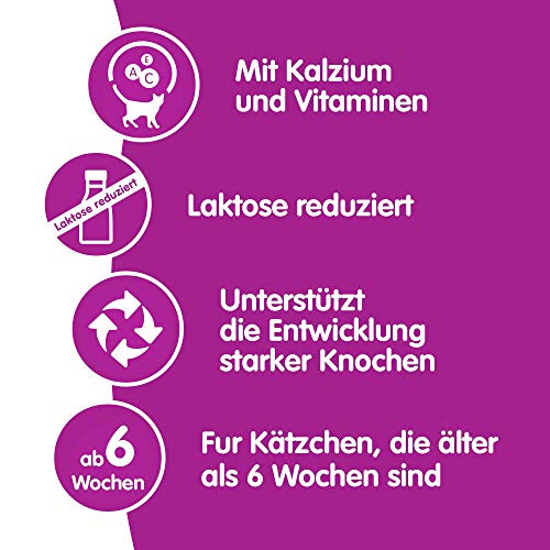 Das enthaltene Kalzium unterstützt das Wachstum gesunder Zähne und Knochen und fördert die Entwicklung des Katzenbabys optimal