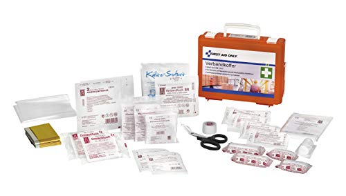 Der orange First Aid Only Verbandkoffer mit Griff entspricht der DIN-Norm 13157 und eignet sich daher für Betriebe und Baustellen gemäß Arbeitsstätten-Richtlinien. Die Inhalte entsprechen somit den darin vorgeschriebenen Verbandstoffen und Erste-Hilfe-Materialien: Neben einer Heftpflasterspule sind verschiedene Verbände, Kompressen, Binden, Tücher und Pflaster sowie eine Rettungsdecke in gold/silber, eine Erste-Hilfe-Schere und Einmalhandschuhe enthalten. Beiliegend sind auch eine Erste-Hilfe-Broschüre und ein Inhaltsverzeichnis. Der Erste Hilfe Koffer verfügt zudem über eine abnehmbare Wandhalterung, die sich mit den 4 zusätzlich enthaltenen Schrauben mit passenden Dübeln anbringen lässt sowie über 3 Trennscheiben, mit denen der Kofferinhalt in Fächern sortiert werden kann.
