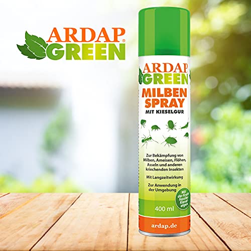ARDAP GREEN Milbenspray mit Kieselgur 400ml – Mit Langzeitwirkung gegen Milben, Ameisen, Flöhen, Asseln und mehr – Kieselgur speziell für Hühner, Anti Milben Hühner