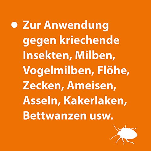 Das langanhaltende Insektenspray wirkt insbesondere gegen kriechende Insekten wie Milben, Flöhe, Zecken und Ameisen, die sich gerne in Kellern, im Garten und in Wohnräumen aufhalten
