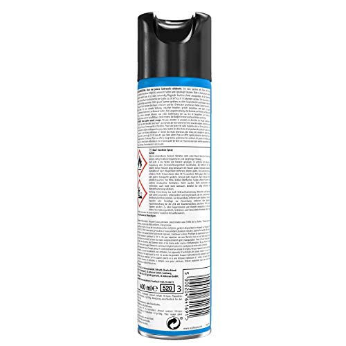 Raid bietet seit mehr als 50 Jahren effektiven Insektenschutz, der Sie und Ihre Familie schützt. Raid Insektenschutz Spray wirkt zuverlässig gegen Insekten wie z. B. Fliegen, Mücken, Wespen und Motten (Textil Motten). Vor dem Sprühen mit Raid Insekten-Spray alle Türen und Fenster schließen. Dose vor jedem Gebrauch schütteln. Zum Sprühen Aerosoldose möglichst senkrecht halten und Sprühknopf drücken. Produkt vorsichtig verwenden. Nicht in Richtung des Gesichtes sprühen. Für eine schnelle Wirkung können einzelne Insekten aus ca. 0,5 cm gezielt besprüht werden. Nicht gegen Wespennester sprühen. Terrarien, Aquarien oder Tierkäfige vor Anwendung entfernen oder abdecken. Aquarienbelüftung für die Zeit der Raumbehandlung abschalten. Für einen Raum durchschnittlicher Größe (ca. 30 m³) ca. 8 – 10 Sekunden sprühen. Den Raum dabei in der Mitte beginnend gleichmäßig aussprühen. Nicht gegen Tapeten sprühen, zu allen Gegenständen und Wänden mindestens 1 m Abstand halten. Nach dem Sprühen den Raum verlassen und für 15 Minuten geschlossen halten. Danach gründlich (ca. 15 – 20 Minuten) lüften. Für Langzeitkontaktwirkung die Bereiche um Fenster und Türen, durch die die Insekten ins Haus gelangen können, aus einer Entfernung von ca. 0,5 m besprühen. Zur Prüfung der Materialverträglichkeit zuvor an einer unauffälligen Stelle testen.