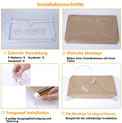 【Einfach zu installieren】 Es kann ohne Werkzeug installiert werden. Das Katzenhängematten-Fensterbett spart Ihren Platz und bietet Ihrer Katze einen sicheren und bequemen Sonnenhängemattensitz. Hinweis: Achten Sie darauf, das Fenster und den Saugnapf vor dem Anbringen zu reinigen. Wenn Wasser im Fenster ist, haftet der Saugnapf nicht. Platzsparendes Design: Der faltbare Rahmen hat zwei Haken, die keine Stellfläche beanspruchen und viel Platz sparen