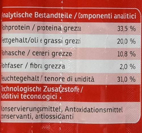 Fleisch und tierische Nebenerzeugnisse (95 %, davon 6 % Pute, 6 % Leber), Öle und Fette, pflanzliche Nebenerzeugnisse, Mineralstoffe.