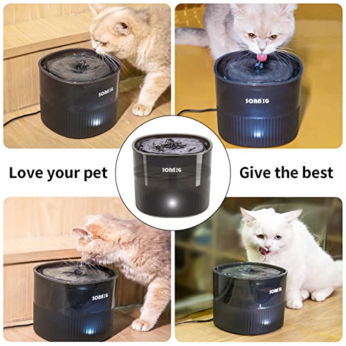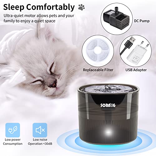 SONNIG Trinkbrunnen für Katze, Durchscheinender Wasserspender Katzen mit Wasserstandsfenster & LED-Licht, 1.8L Trinkbrunnen für Hunde, ultraleise Pumpe mit 1.5 m USB Ladekabel &Trinkbrunnen Stecker