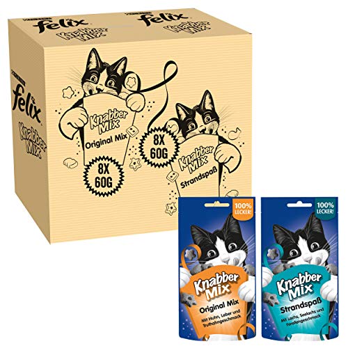 FELIX Knabber Mix Original & Strandspaß, Katzensnack mit verschiedenen Sorten, 2er Pack (2 x 8 Beutel à 60g)